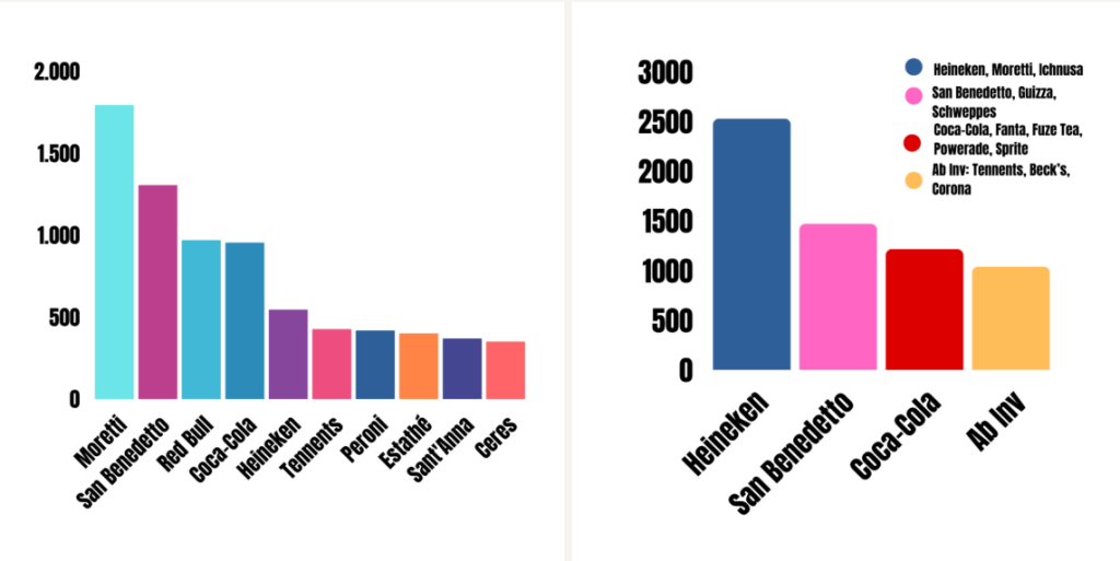 Considerando invece i gruppi con più marchi nel portafoglio, il gruppo Heineken (che include anche Moretti e Ichnusa) si colloca al primo posto, seguito da San Benedetto, Coca Cola, e dal gruppo Ab Inv.