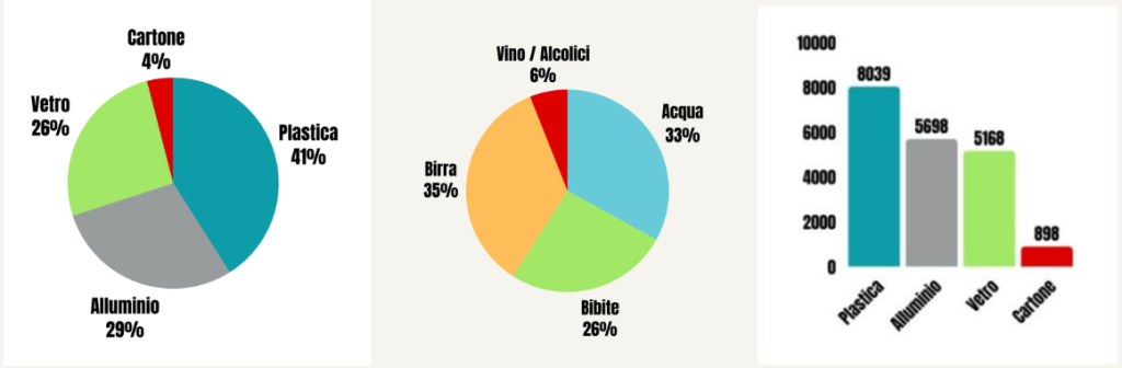 Anche per il 2025 i risultati di questo brand audit nel milanese evidenziano una prevalenza della plastica (41%) come materiale dei contenitori seguita dall’alluminio delle lattine (29%), dal vetro (26%) e dai cartoni per bevande (4%).